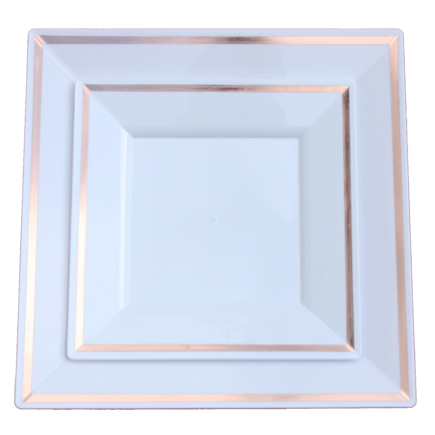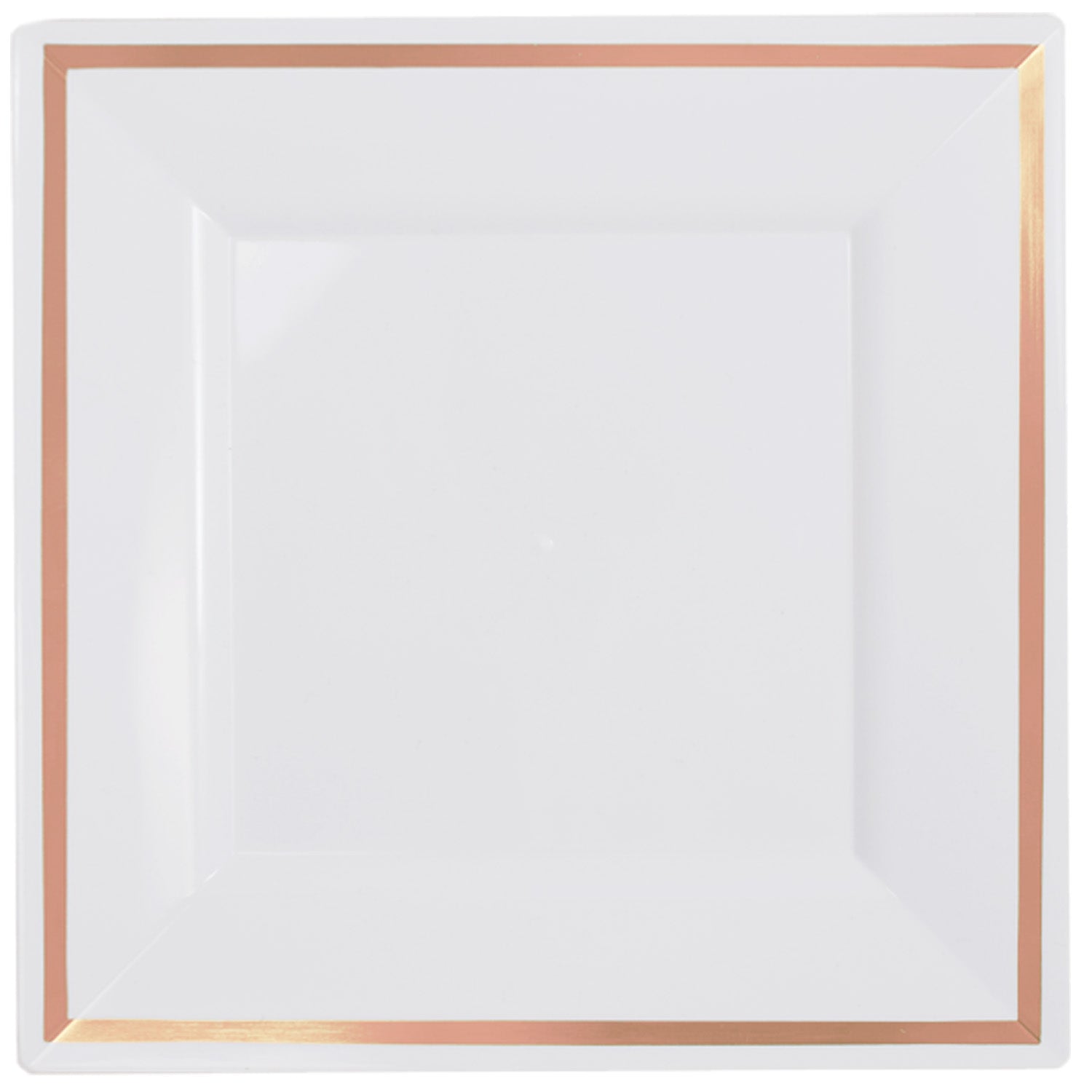 Delight dinner guests at your next event with our white and Rose Gold square plates. Made of premium plastic, each plate combines the convenience of a disposable with the stunning appearance of real china. Each plate features an elegant, metallic Rose Gold accent line that is certain to enhance any table setting. Perfect for weddings, engagement parties, and other elegant events.
