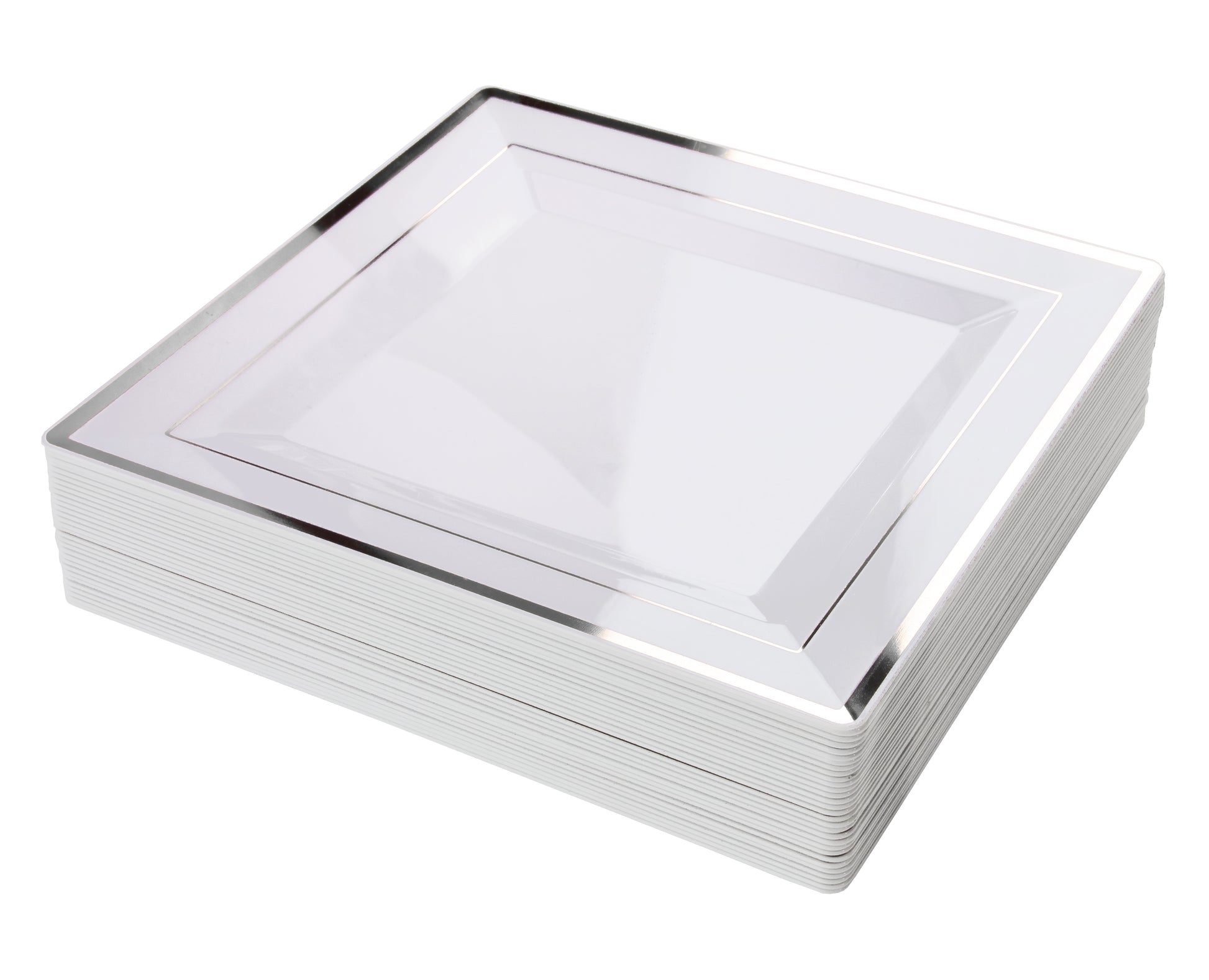 Delight dinner guests at your next event with our white and silver square plates. Made of premium plastic, each plate combines the convenience of a disposable with the stunning appearance of real china. Each plate features an elegant metallic silver accent line that is certain to enhance any table setting. Perfect for weddings, engagement parties, and other elegant events.