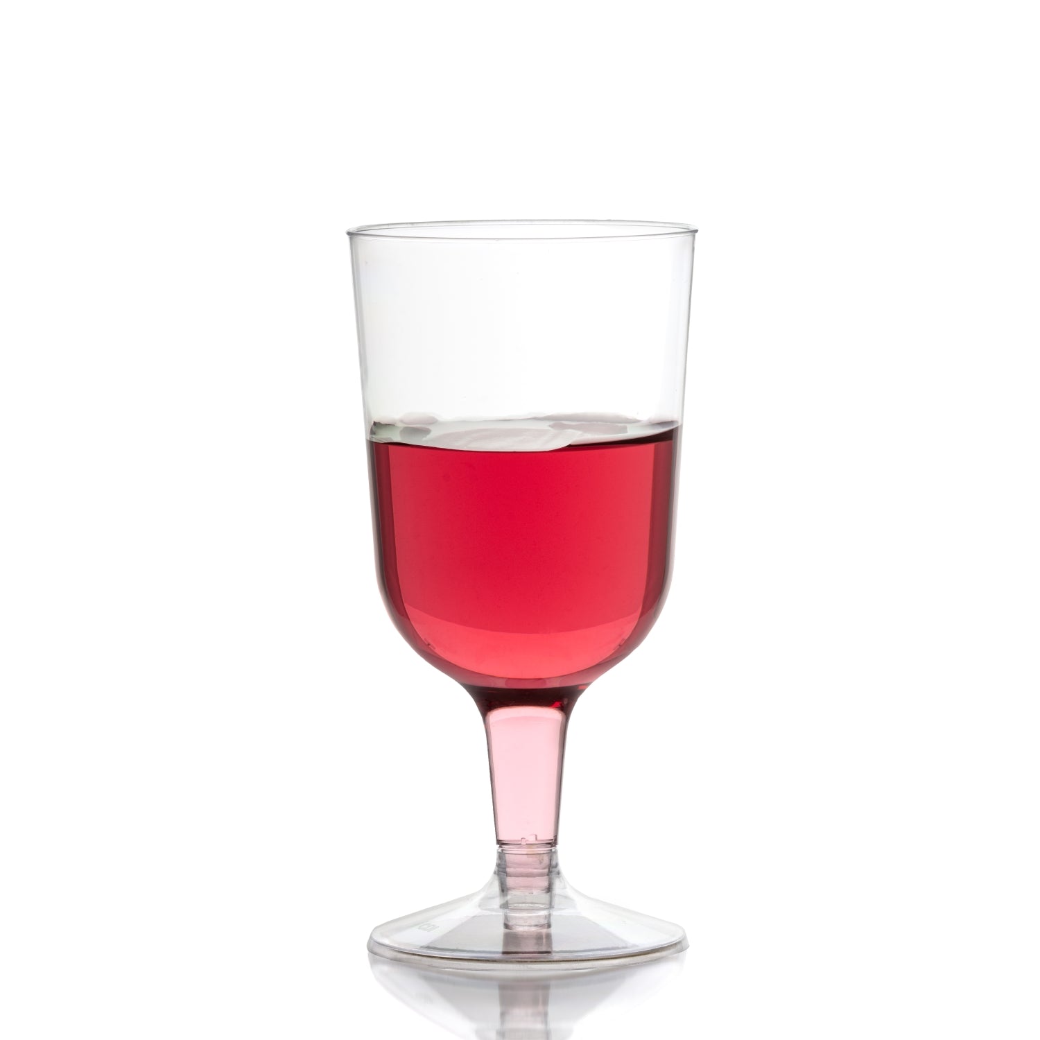 These 5.5 oz. two piece clear plastic wine cups are the perfect way to serve drinks at your next event. Made of heavy duty plastic, these wine cups feature a crystal clear design and sturdy base. Great for cocktail parties, formal events, and much more!