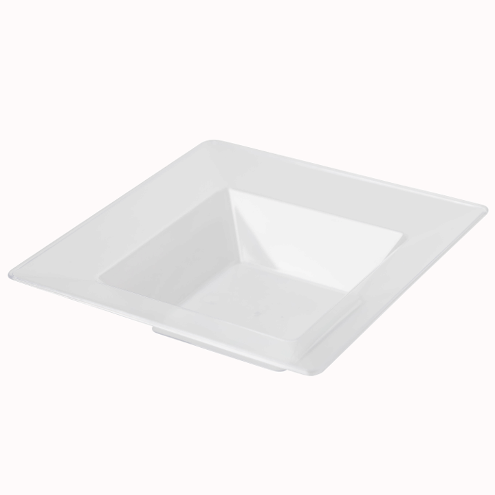 These Clear square bowls are the best way to serve with class! Each package contains 10 Clear plastic square bowls which can be disposed of after use, or used over and over. These low priced cheap square bowls are great for elegant events, wedding functions, or corporate events. This beautiful strong square bowl in Clear will treat your guests to culinary presentation they would have never seen! Each of these Clear square disposable bowld holds approximately 12 oz. and measures 8.5".