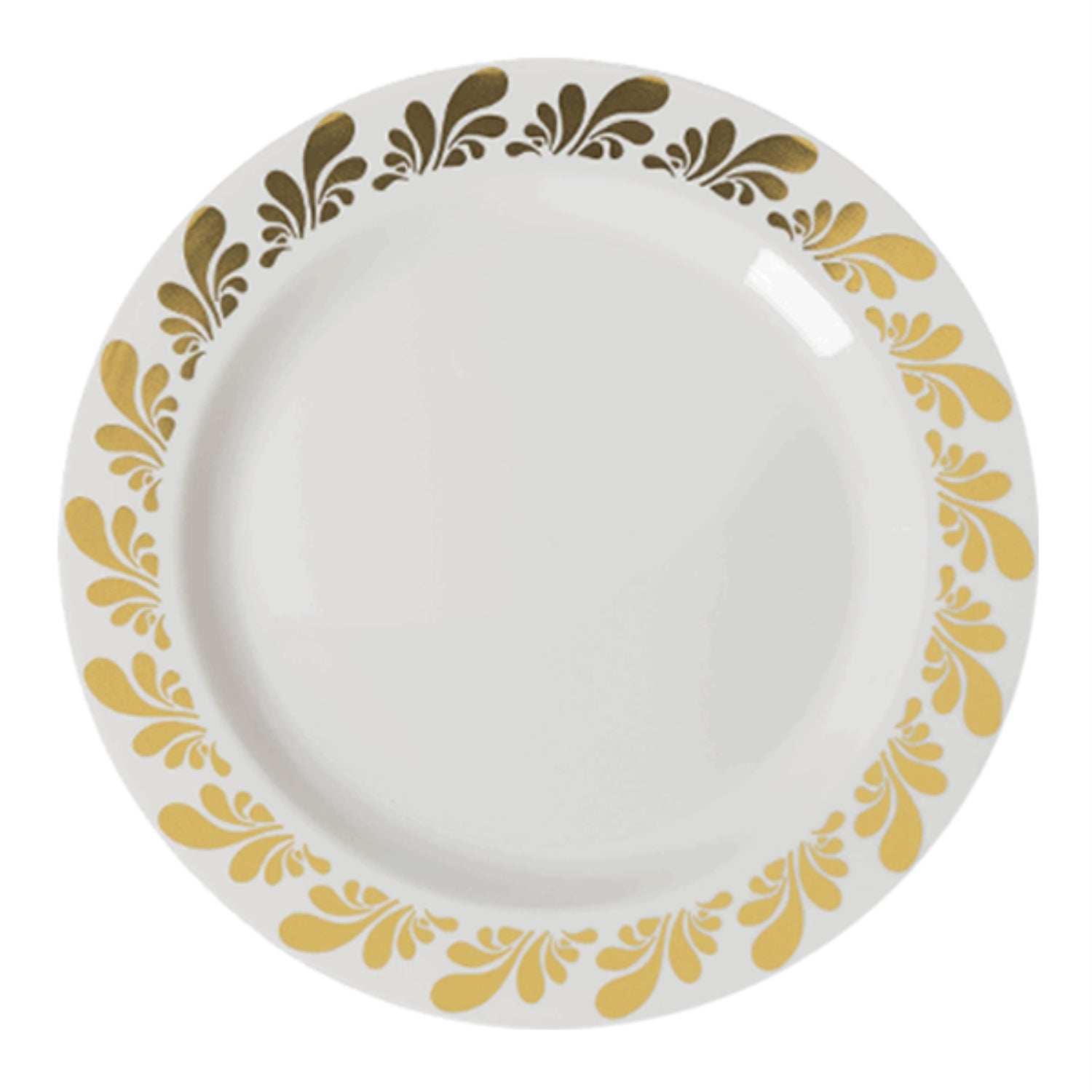 Delight dinner guests at your next event with our Splash Design plates. Made of premium plastic, each plate combines the convenience of a disposable with the stunning appearance of real dinnerware. Each plate features beautiful metallic accents that are certain to enhance any table setting. Perfect for weddings, birthday parties, and more!