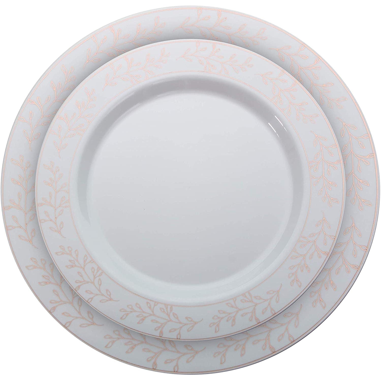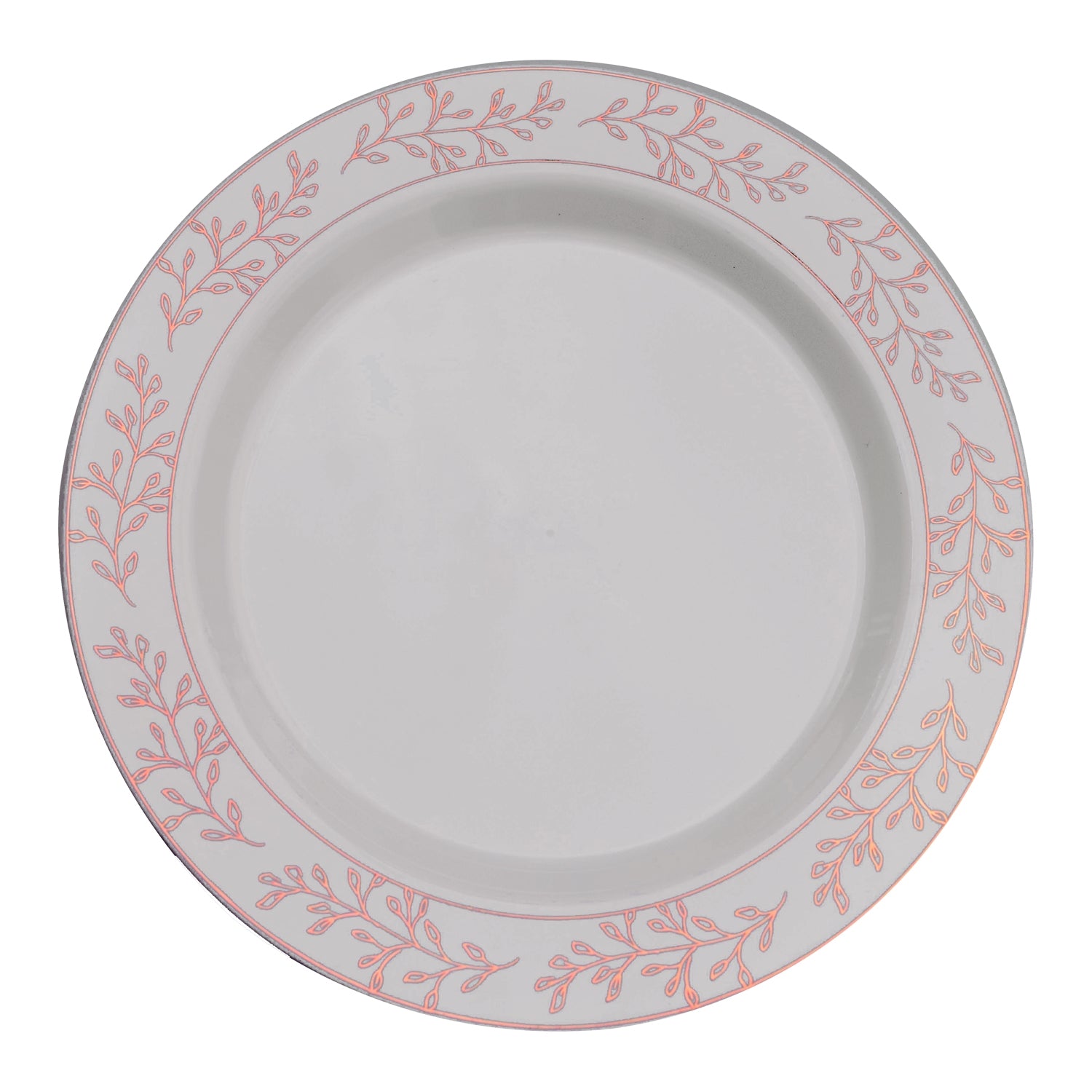 These elegant 10.25 White dinner plates feature a White base with Rose Gold Metallic Leaf trim. Designed to look like real China while priced so that they can be used as a disposable, these plates are a must-have for any formal affair. Each package contains 10 of these stunning plastic plates. Perfect for use as a dinner plate, these magnificent plates can also be cleaned and re-used for your next event!