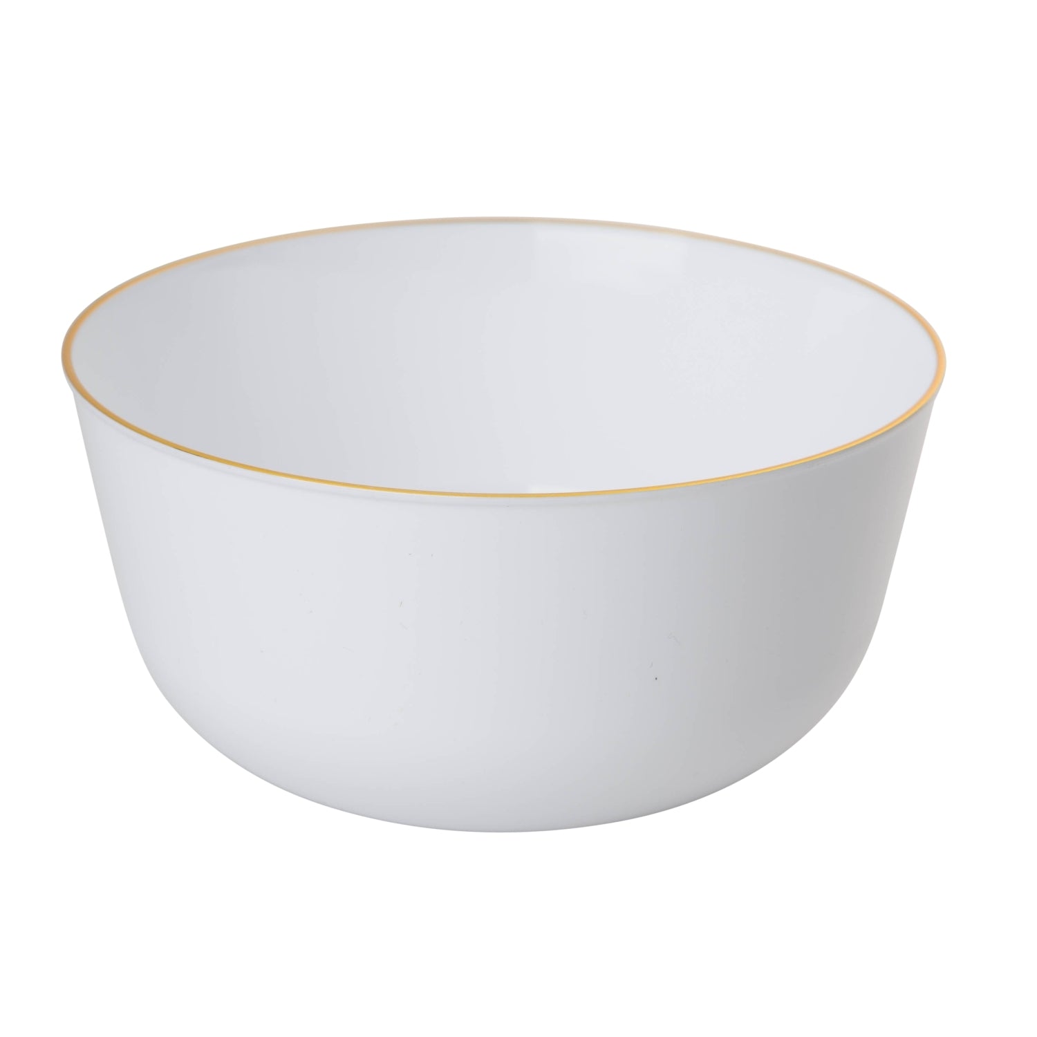 These stunning disposables are part of the Trendables™ collection of fine dinnerware. Each plastic bowl measures 24 oz. This bowl is part of the Flora series and features a solid white base with a gold hot stamped rim. Coordinates with additional Flora series disposables. Each package contains 10 exquisite bowls.