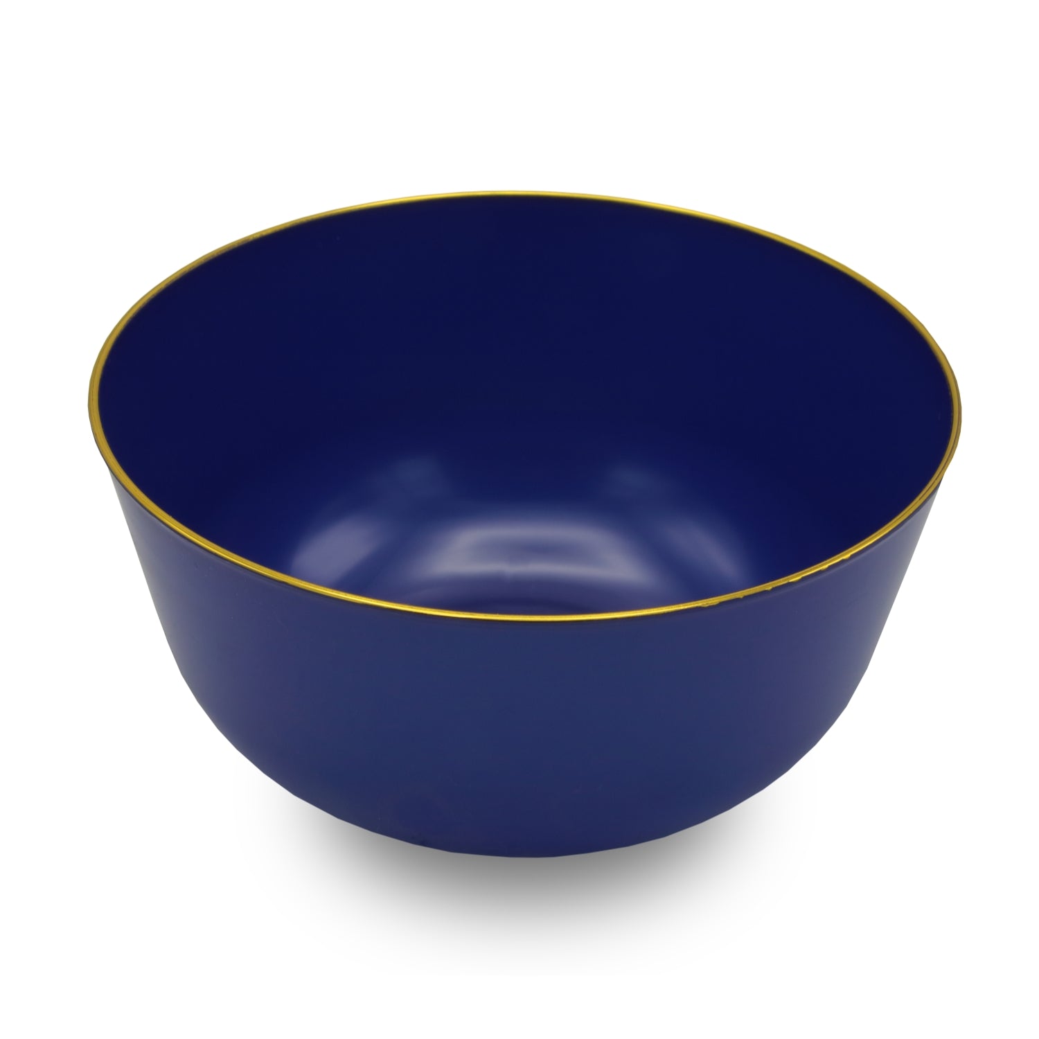 These stunning disposables are part of the Trendables™ collection of fine dinnerware. Each plastic bowl measures 24 oz. This bowl is part of the Glam series and features a navy base with a hot stamped Gold rim. Coordinates with additional Glam series disposables. Each package contains 10 exquisite bowls.