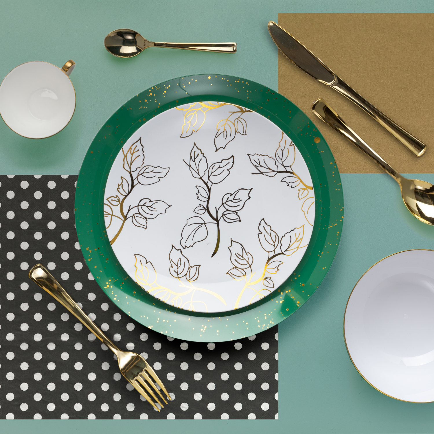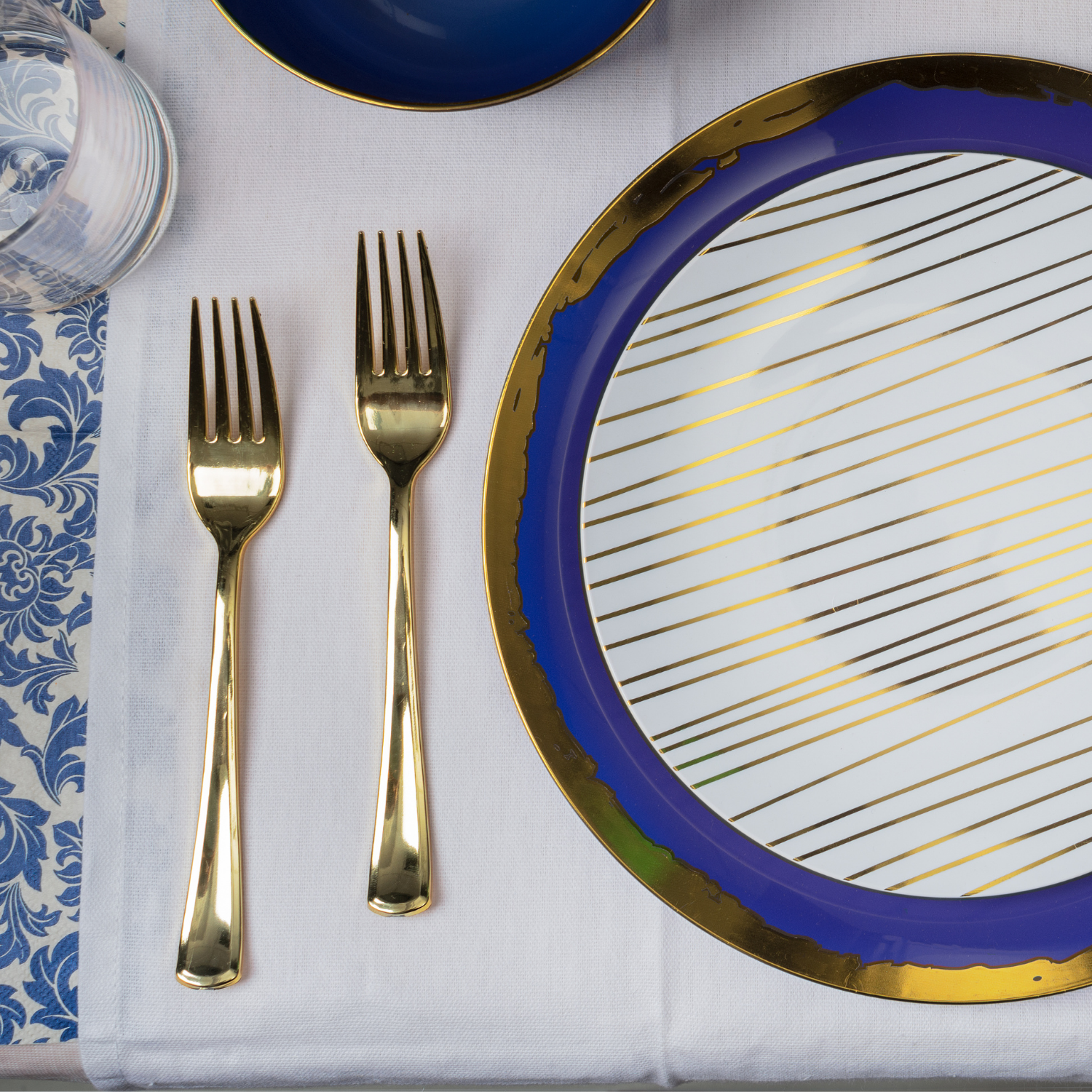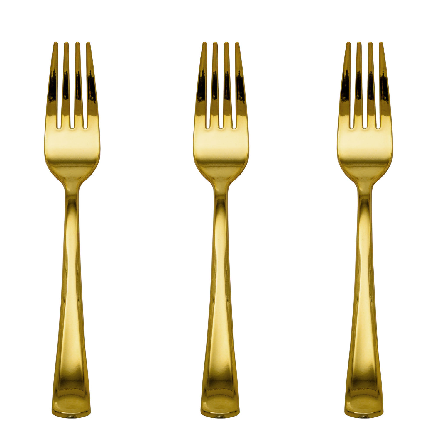 Delight dinner guests at your next event with our metallic gold plastic forks. Made of high quality plastic, each fork combines the convenience of disposable plastic with the stunning appearance of real cutlery. Exquisite Classic flatware is a cost effective and simple way to turn a wedding, cocktail party, or formal affair into a glamorous event!