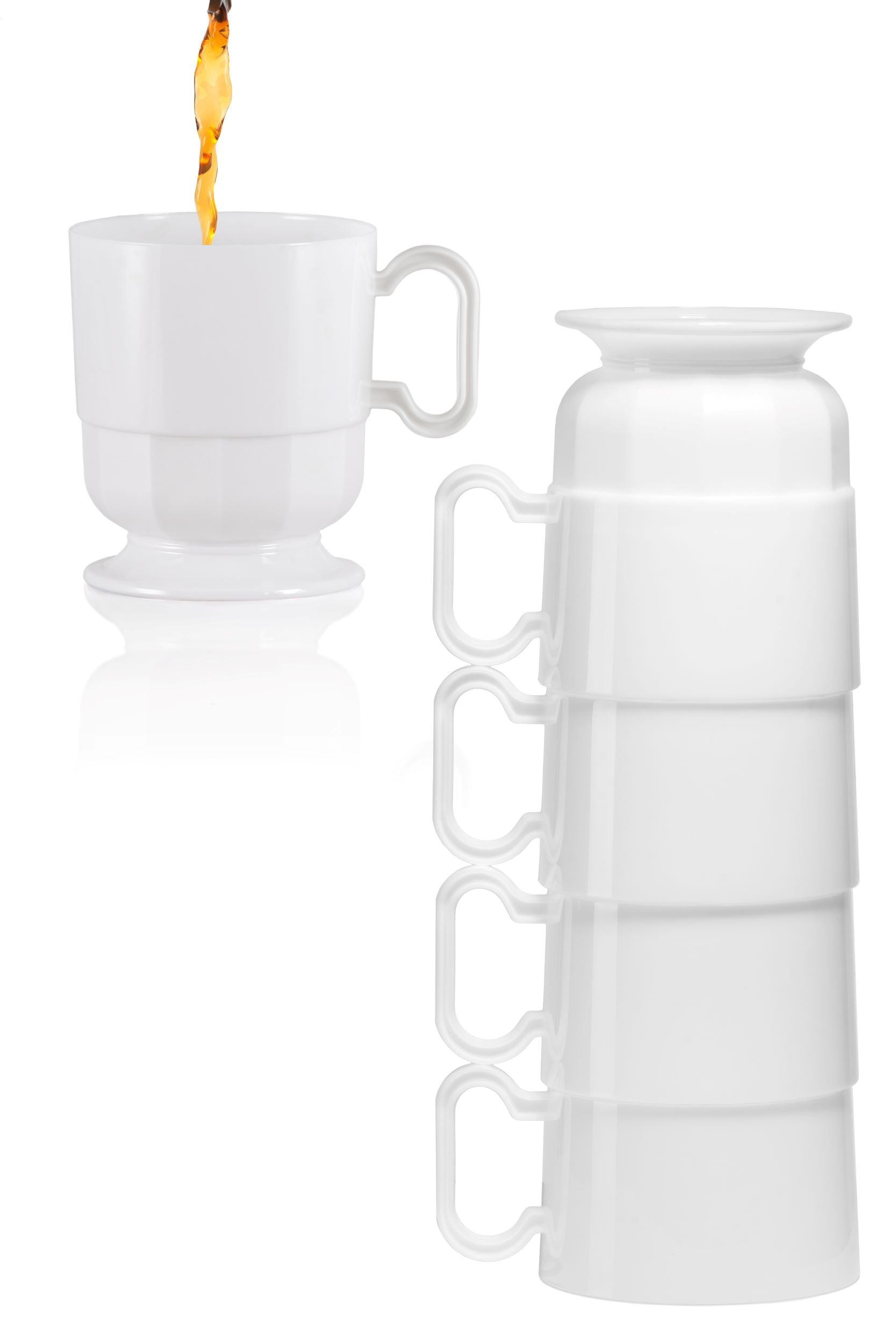 1 package of 8 8 oz. White Glazed Coffee Cups with handles. When ordinary hot/cold cups wont do our two-toned designer coffee mugs come to the rescue! Perfect for luncheons, buffets, parties or any event where coffee, cappuccinos, lattes, cocoa or other hot confections might be served. See our full line of fancy disposable table ware including matching cups, bowls, plates, serve and barware.