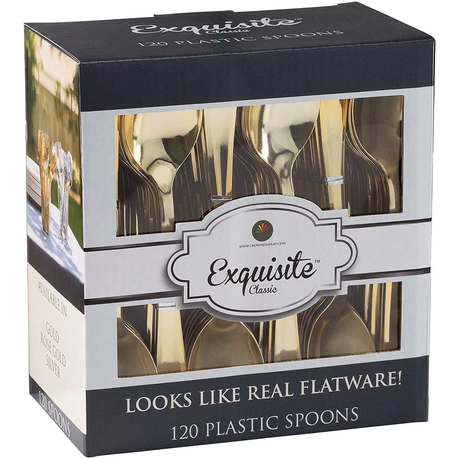 Delight dinner guests at your next event with our metallic gold plastic spoons. Made of high quality plastic, each spoon combines the convenience of disposable plastic with the stunning appearance of real cutlery. Exquisite Classic flatware is a cost effective and simple way to turn a wedding, cocktail party, or formal affair into a glamorous event!