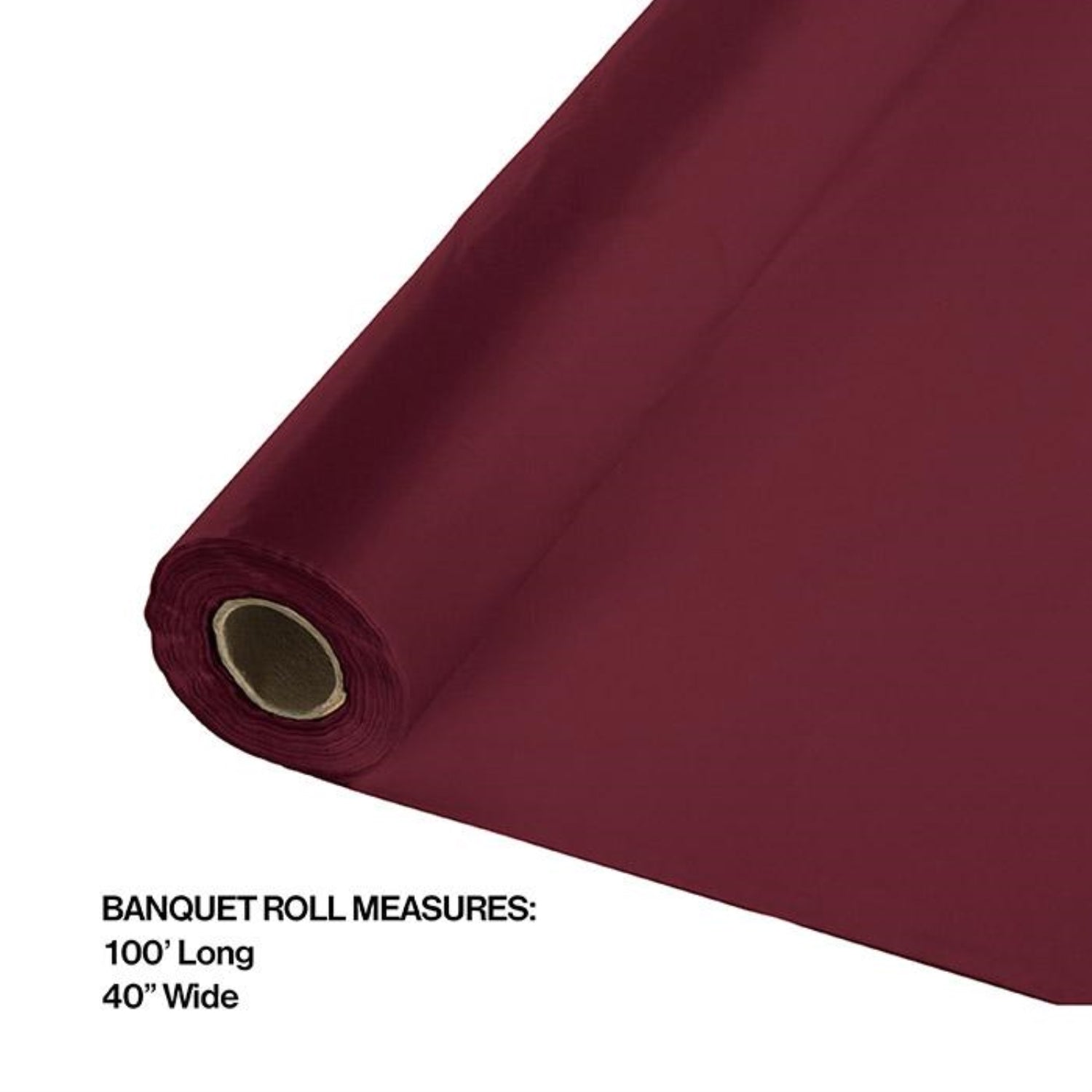 This roll of Burgundy colored plastic table covering measures 40" wide x 100' long. Each roll should be sufficient for covering approximately 12 tables. Our tablecovers have a very high opacity so that they can be used on any table with minimal transparency. Your tables will look elegant with these beautiful colored tablecloths. When the party is over, cleanup is easy - just roll up the table cover and throw the mess away!