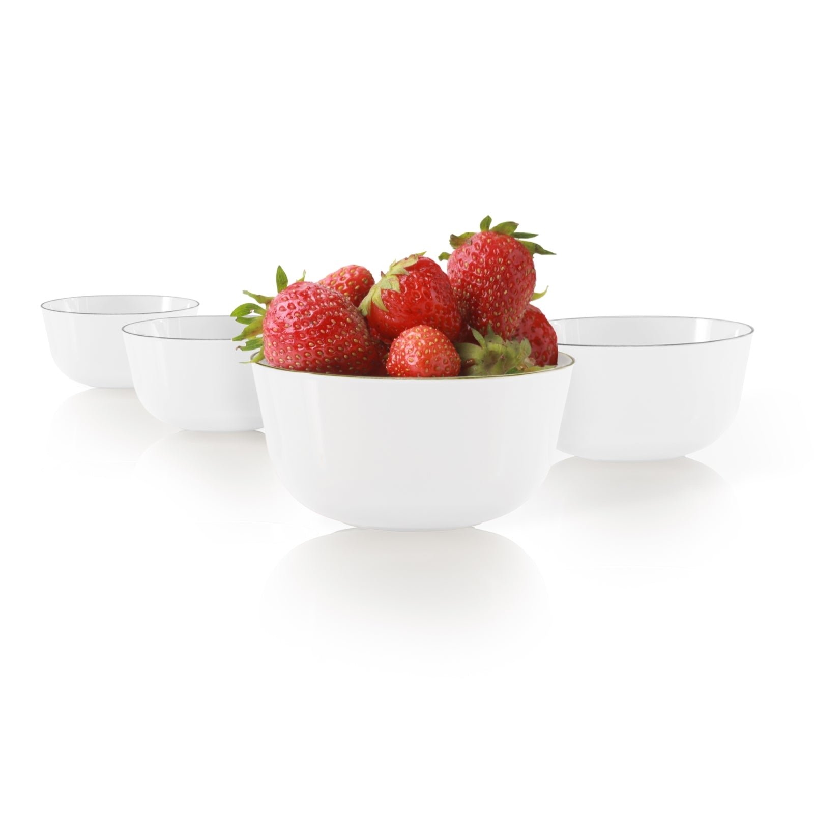 These stunning disposables are part of the Trendablesâ„¢ collection of fine dinnerware. Each plastic bowl measures 24 oz. This bowl is part of the Geo series and features a white base with a hot stamped Silver rim. Coordinates with additional Geo series disposables. Each package contains 10 exquisite bowls.