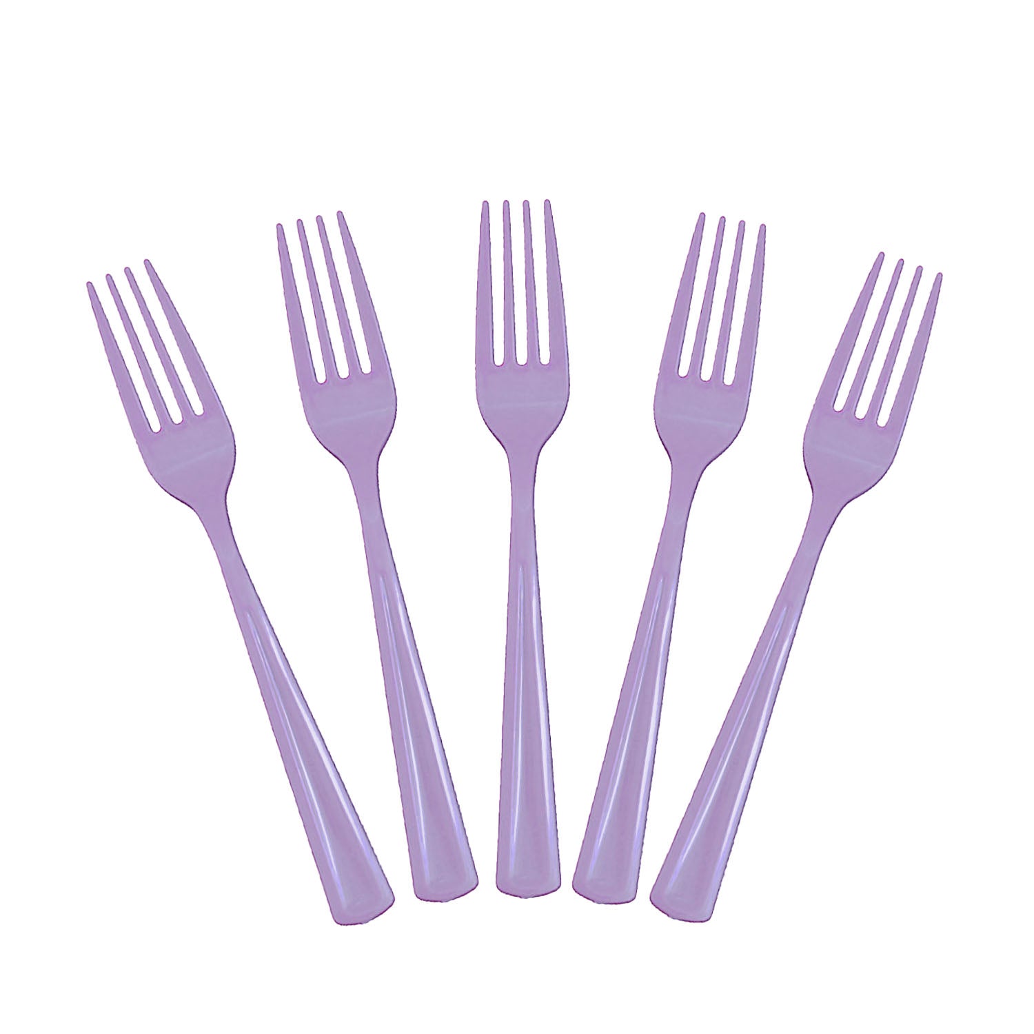 Delight dinner guests at your next event with our selection of heavy weight plastic forks. Each package contains 50 lavender forks. Plastic flatware is a cost effective and simple way to turn a birthday party, dinner party, or formal affair into a wonderful, stress free event!