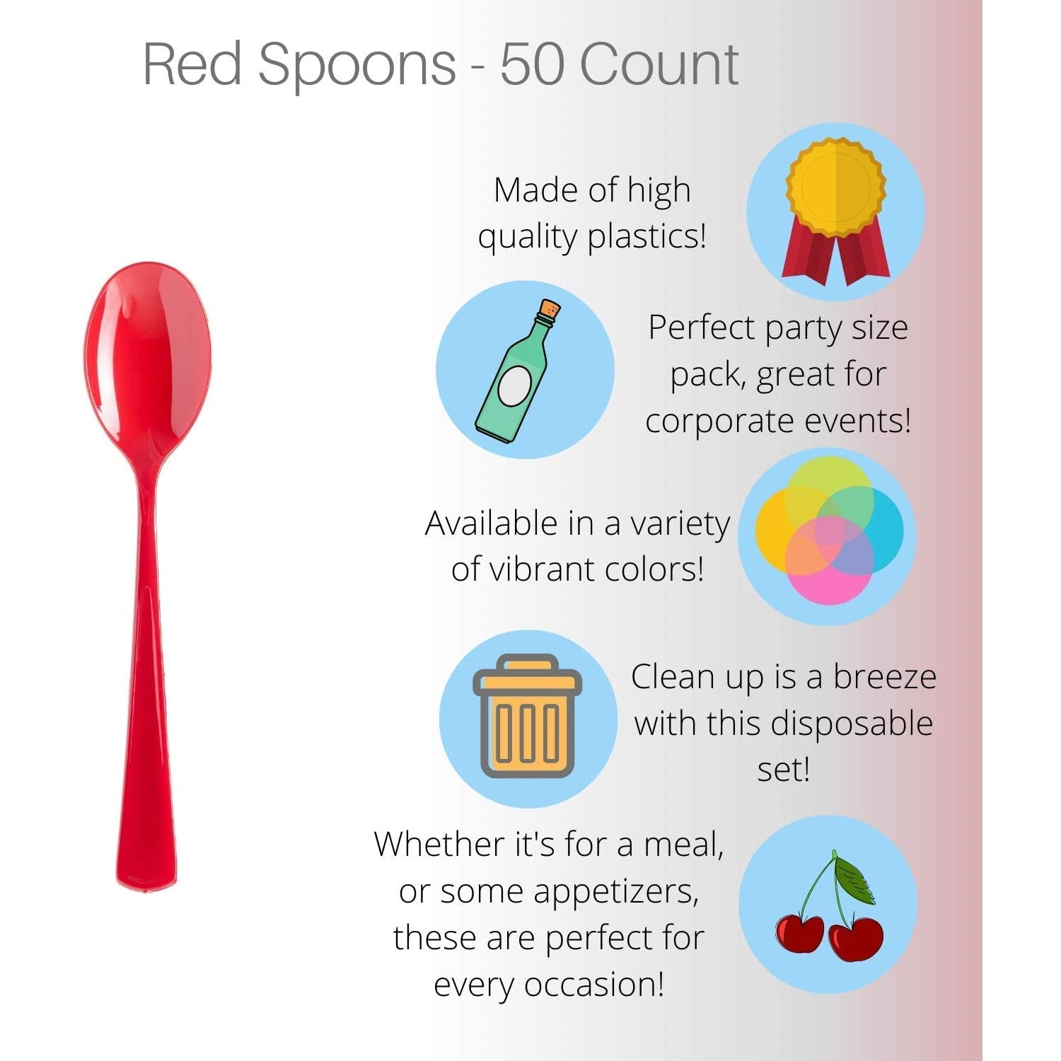 Delight dinner guests at your next event with our selection of heavy weight plastic spoons. Each package contains 50 red spoons. Plastic flatware is a cost effective and simple way to turn a birthday party, dinner party, or formal affair into a wonderful, stress free event!